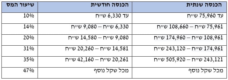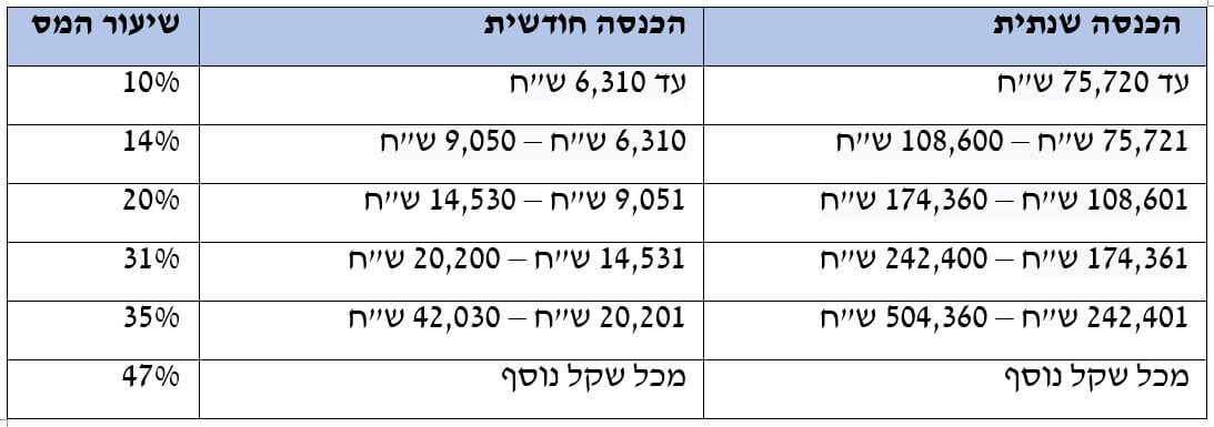 מס הכנסה לשכירים החל מ 1.1.2017. מדרגות מס הכנסה מתעדכנות מדי שנה ולפיהן נקבע מס הכנסה בהתאם לגודל ההכנסה ולנתונים נוספים מדרגות המס מופעלות על בסיס הכנסה שנתית. כלומר המדרגות החודשיות מתייחסות לחודש משכורת אחד, והמצטברות מסכמות את המדרגות מידי חודש. טבלת מדרגות מס 2021 חודשי / מדרגות מס הכנסה 2021 שנתי להדפסה באתר. בדיקה בוועדה רפואית לעניין מס הכנסה. רשימת טלפונים של סניפי הביטוח הלאומי. בחודש ינואר 2019 מעדכנת רשות המיסים מס הכנסה את טבלאות מס שולי 2019 ואלו משמשות לחישוב מס הכנסה ממשכורת של שכיר או מהכנסה של שכיר. מדרגות מס לשכיר 2019 טבלה מעודכנת. על פי פקודת מס הכנסה, מוענק למשתחררים מ'שירות סדיר זיכוי על הכנסתם מיגיעה אישית, במשך 36 החודשים הראשונים שלאחר חודש שחרורם מן השירות הסדיר. פטור ממס הכנסה ניתן למי שנקבעו לו לפחות 90% נכות משוקללת לצמיתות או לתקופה זמנית של מינימום 185 ימים. נשאר רק להשאיר לנו כמה פרטים וניצור איתך קשר. בישראל, כמו במדינות רבות בעולם, מס הכנסה ליחיד הוא פרוגרסיבי, כך שנטל המס עולה ככל שהשכר עולה. שיטה זו נקראית מדרגות מס.